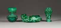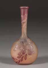 Farbloses Glas, weißer, violetter und grüner Überfang, lachsfarbener Unterfang, Ätzdekor, lachsfarbenes Glas, silbergelbe Pulveraufschmelzung. H. 6,5-21,5 cm. Auf Wandung bez. ‚Gallé‘ mit Stern (hochgeätzt). Bestehend aus: 1 Soliflore-Vase ‚Hortensien‘, 1 Miniaturvase, 1 ‚Diaspora‘.