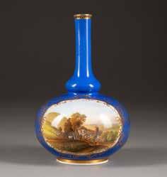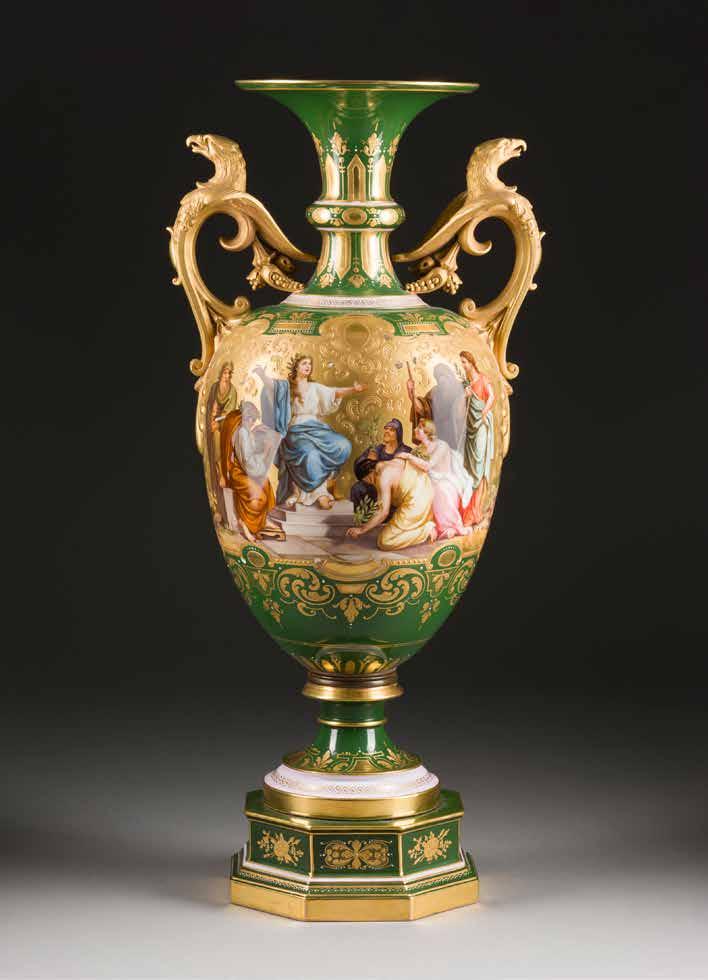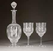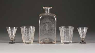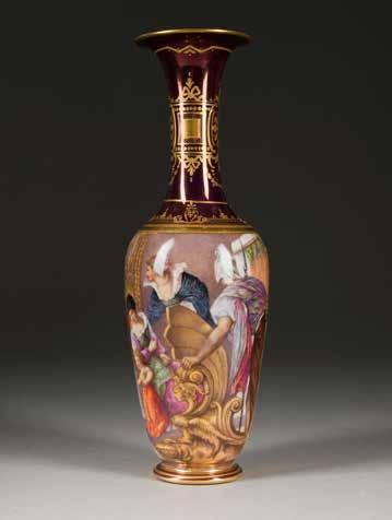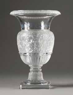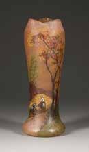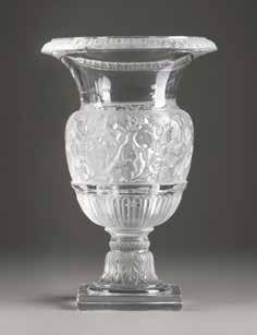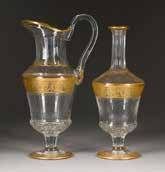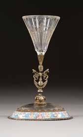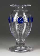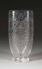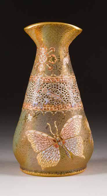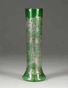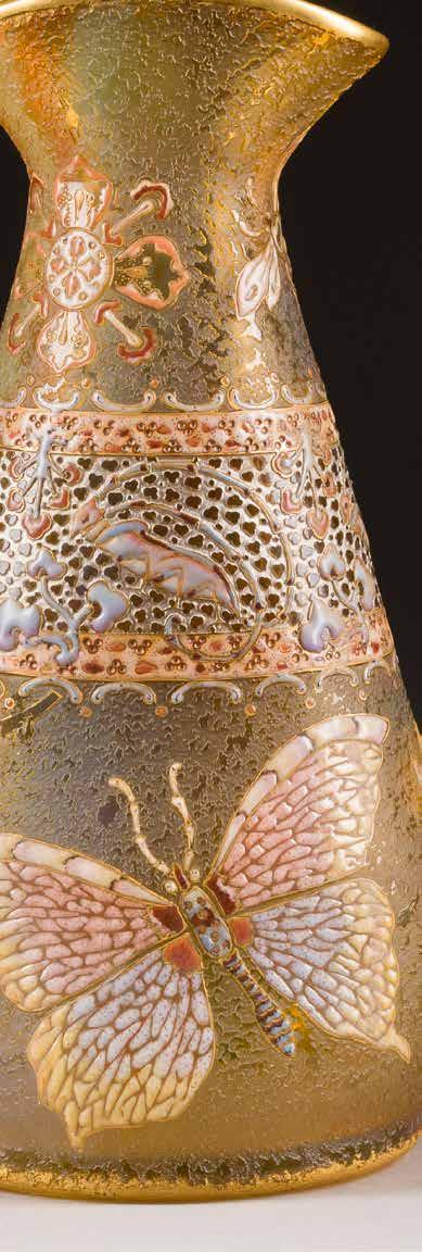 Farbloses Glas, geätztes und emailliertes Dekor, Goldstaffage. H. 28,4 cm. Auf dem Boden befand sich ursprünglich eine Signatur in Gold, die jedoch abgekratzt wurde.