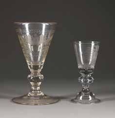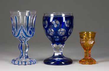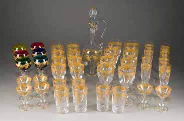 Farbloses Glas, Emailfarbe. H. 28 cm. Bez. im Dekor ‚Leg‘. Farbe part. ber.