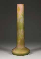 Farbloses Glas, grüner Überfang, rosafarbener Unterfang, Ätzdekor. H. 33 cm. Auf Wandung bez. ‚Gallé‘ (hochgeätzt).
