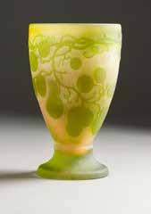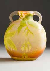 Farbloses Glas, lachsfarbener Unterfang, hell- und dunkelgrüner Überfang, Ätzdekor. H. 20 cm. Auf Wandung bez. ‚Gallé‘ mit Stern. Runder Korpus, beidseitig abgeflacht. Ein Henkel mit Rissen, min. Gebrauchsspuren.