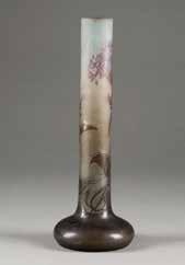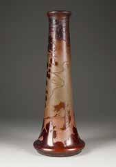 Farbloses Glas, dunkelvioletter Überfang, Ätzdekor. H. 33 cm. Auf Wandung bez. ‚Gallé‘ (hochgeätzt).