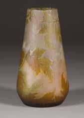 Farbloses Glas, rosafarbener Unterfang, grüner und brauner Überfang, Ätzdekor. H. 20 cm. Auf Wandung bez. ‚Gallé‘ (hochgeätzt).