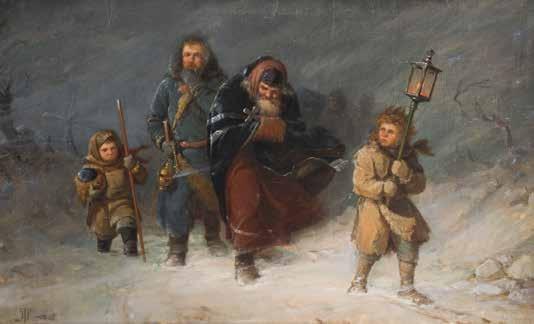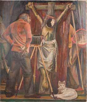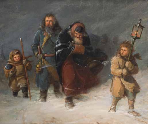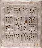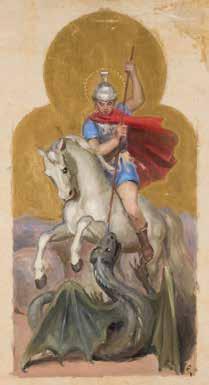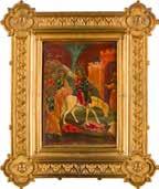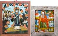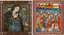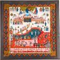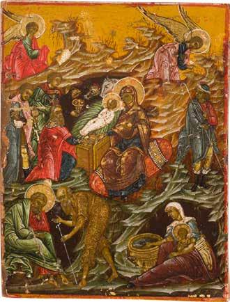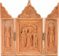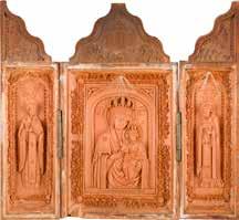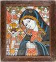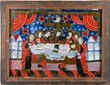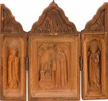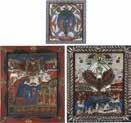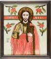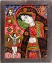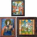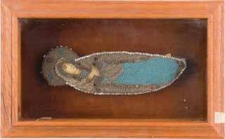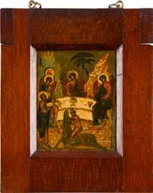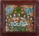 Tempera on wood panel. The robes sewn with seed pearls and glass pearls. 29 cm long, 27 x 44 cm (with glazed frame).