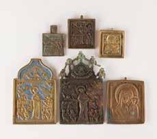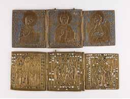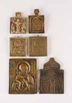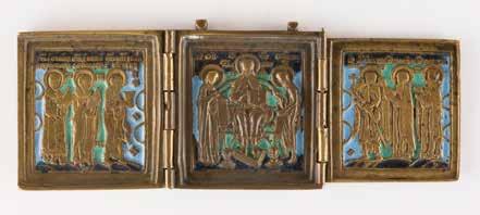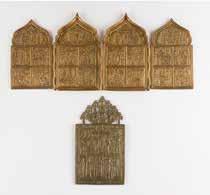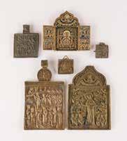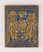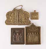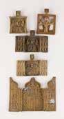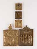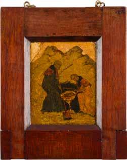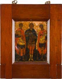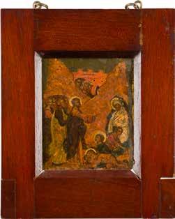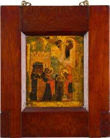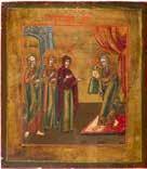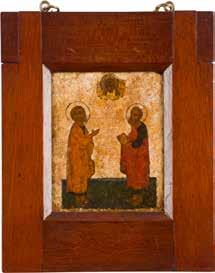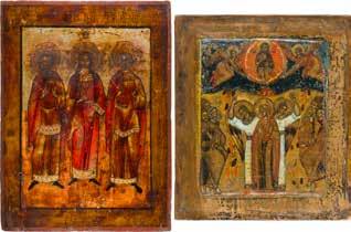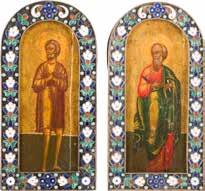Tempera on wood panel with kovcheg. The haloes and background made of gold. The elongated figures depicted, fulllength. The expressive faces rendered delicately, the vestments executed with great precision. Minor vertical cracks, minor losses, partially restored. 31 x 26.4 cm.