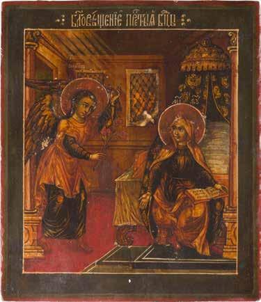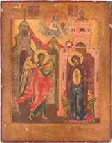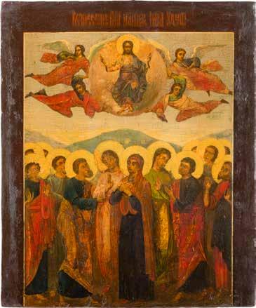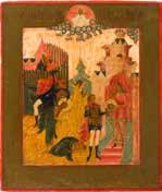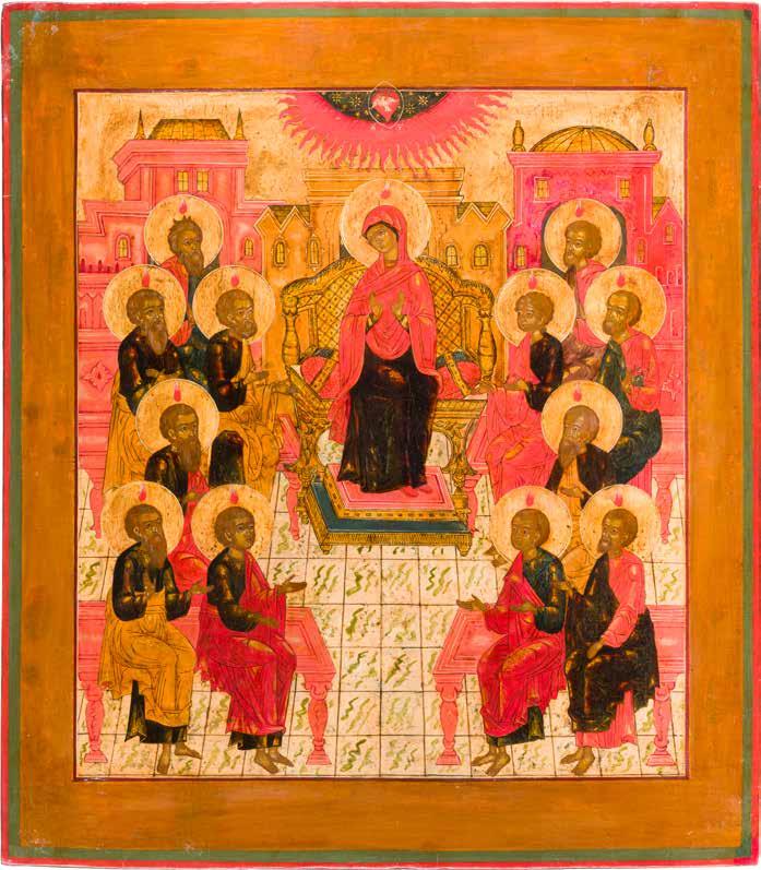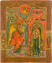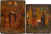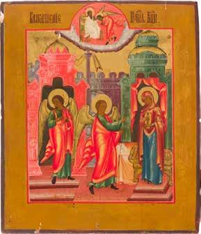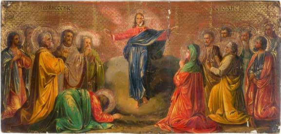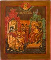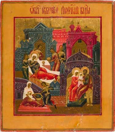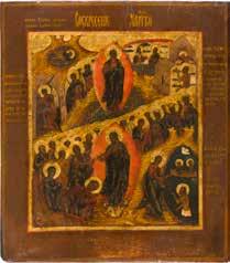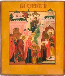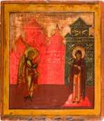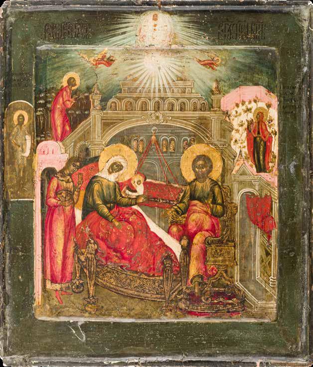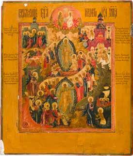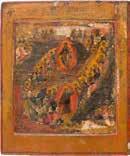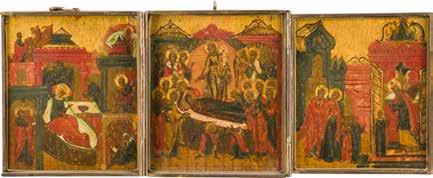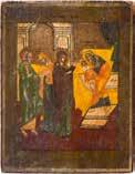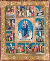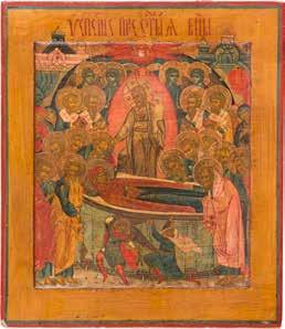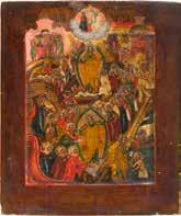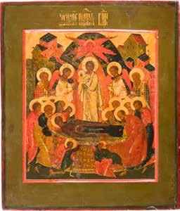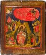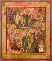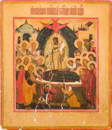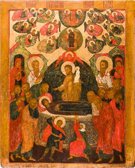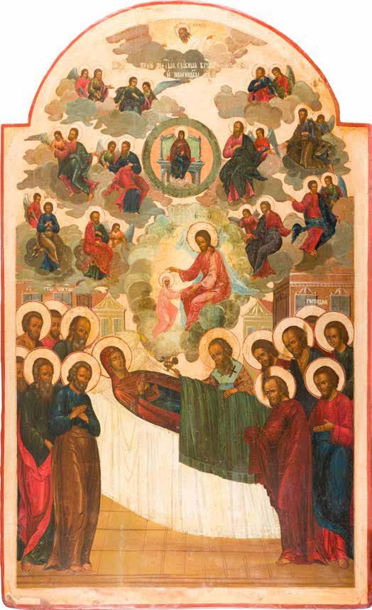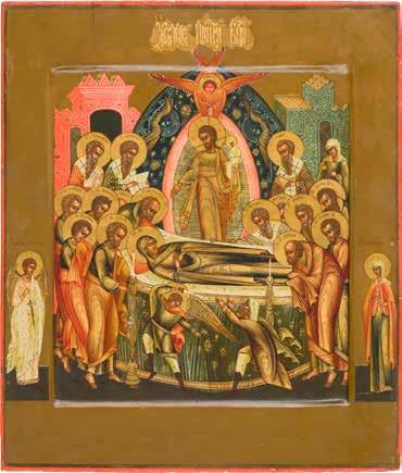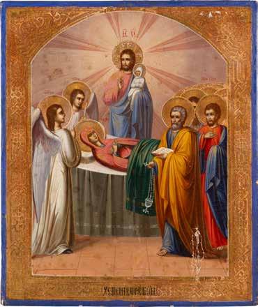 Aus zwei Laubholz-Brettern zusammengefügtes Bildfeld mit zwei profilierten Rückseiten-Sponki. Kowtscheg, Lewkas, Eitempera, partielle Vergoldung. 99 x 80 cm. Horizontale Teilung des Bildfeldes in zwei Register. Im Vordergrund die auf einer Bahre liegende Gottesmutter flankiert von den trauernden Aposteln. Im Bildvordergrund versucht der fanatische Hebräer Jephonias, den Katafalk mit dem Leichnam der Gottesmutter umzustoßen. Ein Engel ist im Begriff ihm seine beiden Hände abzuschlagen. Hinter der Bahree hat Christus die Seele der Entschlafenen bereits in Empfang genommen und hält sie in Form eines Wickelkindes in seinem linken Arm. Er wird von Engeln und einem Seraph entouriert. Mittig im Randbereich stilisierte Architekturkulisse. Das obere Bilddrittel zeigt im Zentrum die vor einer Aureole thronende Gottesmutter, über ihr öffnen zwei Engel die himmlische Sphäre. Zu beiden Seiten wird sie von den auf Wolken herannahenden Aposteln in Begleitung von Engeln flankiert. Kirchenslawischer Titulus am oberen Rand. Ausdrucksstarke Ikone in pastelliger Farbigkeit. Rest.