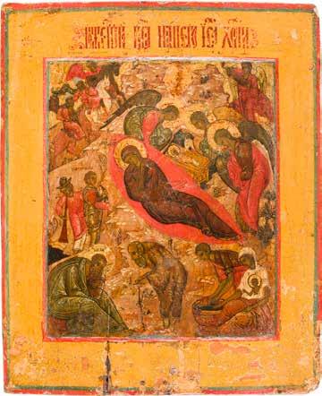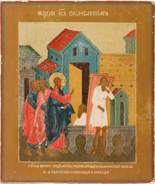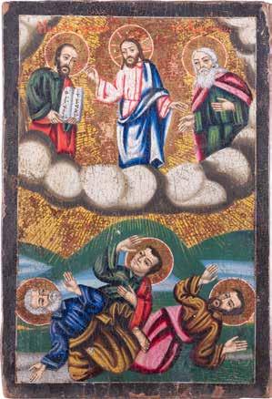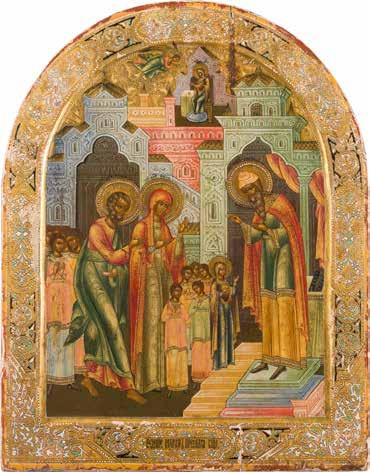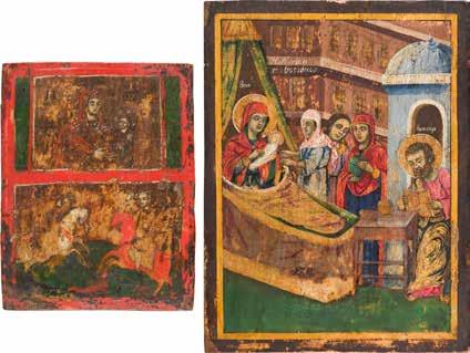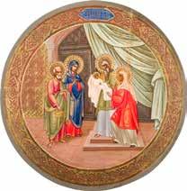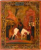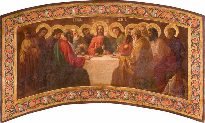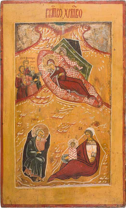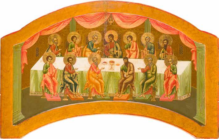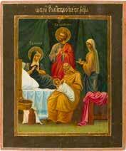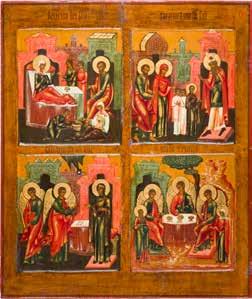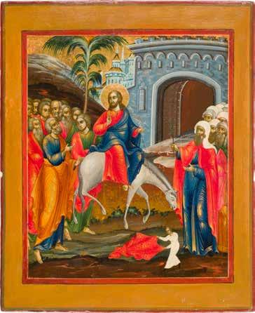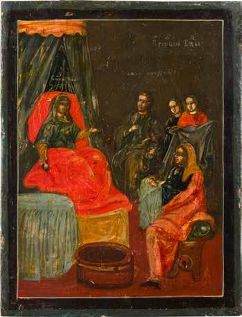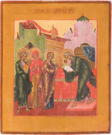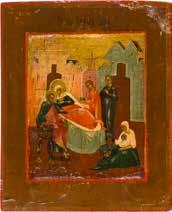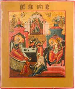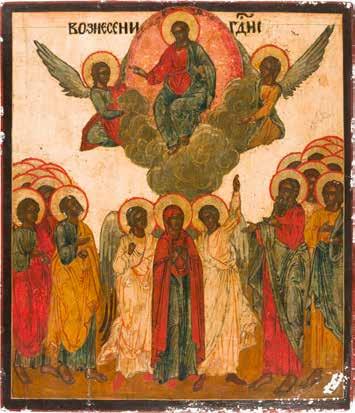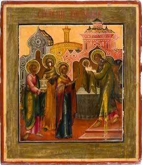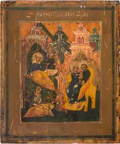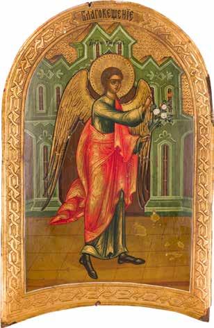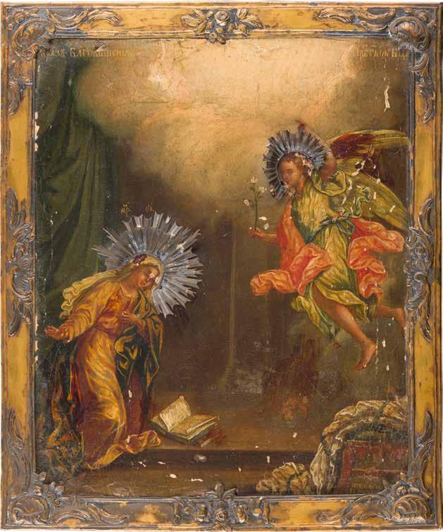 Aus zwei Laubholz-Brettern zusammengefügtes Bildfeld mit zwei profilierten Rückseiten-Sponki. Kowtscheg, Lewkas, Eitempera, partielle Vergoldung. 99 x 80 cm. Horizontale Teilung des Bildfeldes in zwei Register. Im Vordergrund die auf einer Bahre liegende Gottesmutter flankiert von den trauernden Aposteln. Im Bildvordergrund versucht der fanatische Hebräer Jephonias, den Katafalk mit dem Leichnam der Gottesmutter umzustoßen. Ein Engel ist im Begriff ihm seine beiden Hände abzuschlagen. Hinter der Bahree hat Christus die Seele der Entschlafenen bereits in Empfang genommen und hält sie in Form eines Wickelkindes in seinem linken Arm. Er wird von Engeln und einem Seraph entouriert. Mittig im Randbereich stilisierte Architekturkulisse. Das obere Bilddrittel zeigt im Zentrum die vor einer Aureole thronende Gottesmutter, über ihr öffnen zwei Engel die himmlische Sphäre. Zu beiden Seiten wird sie von den auf Wolken herannahenden Aposteln in Begleitung von Engeln flankiert. Kirchenslawischer Titulus am oberen Rand. Ausdrucksstarke Ikone in pastelliger Farbigkeit. Rest.