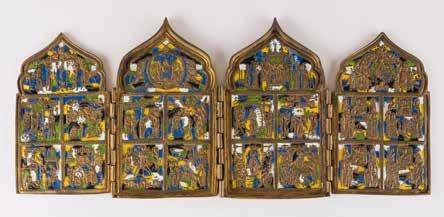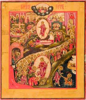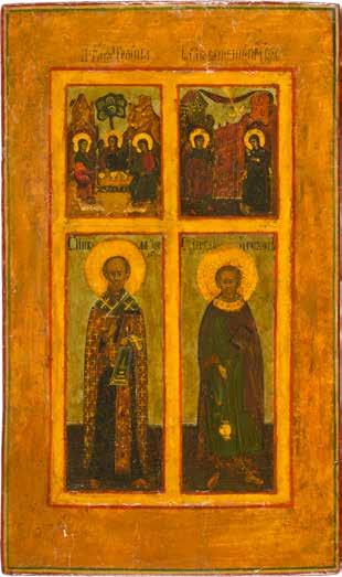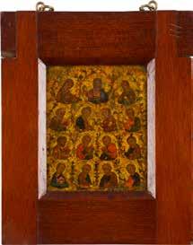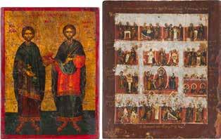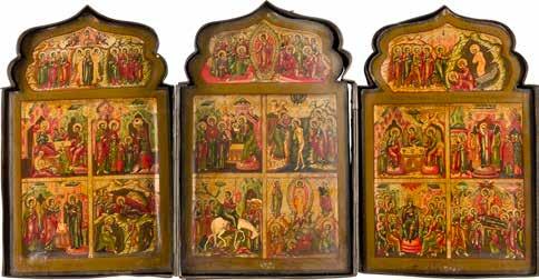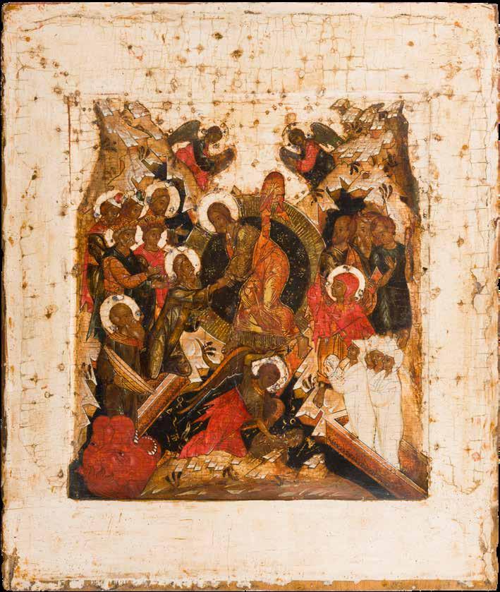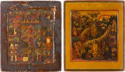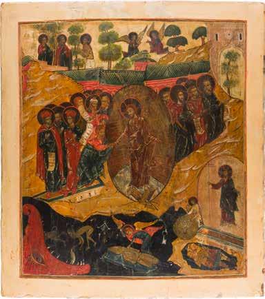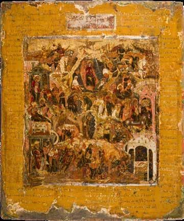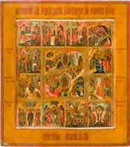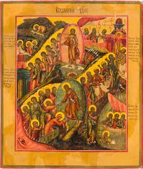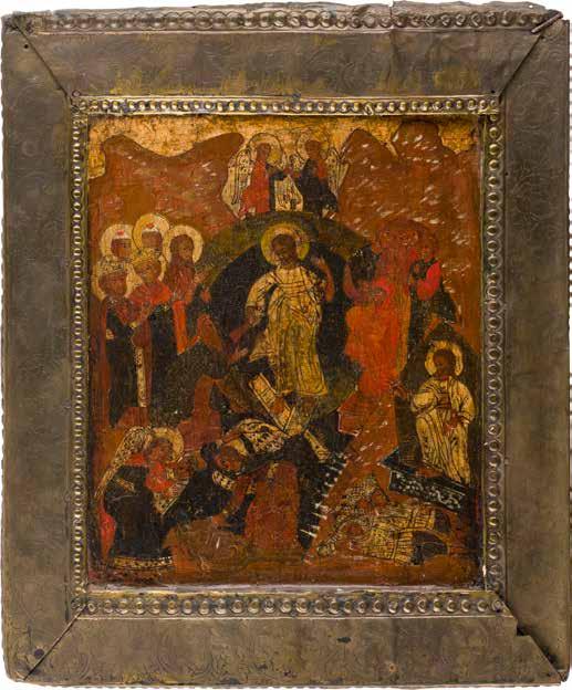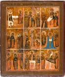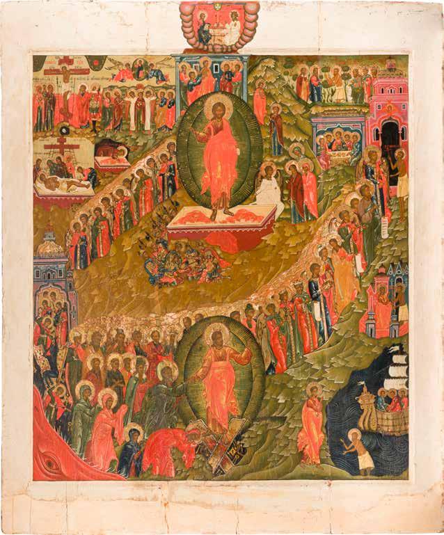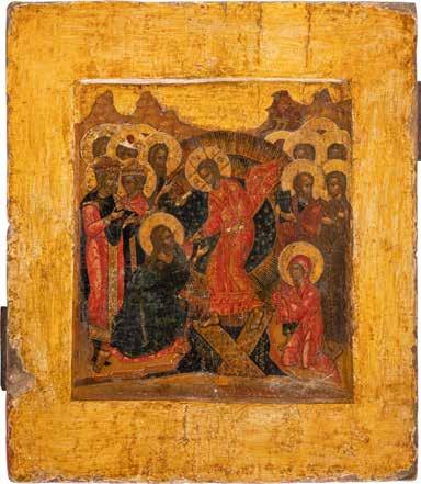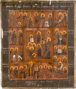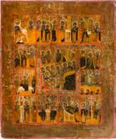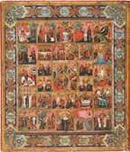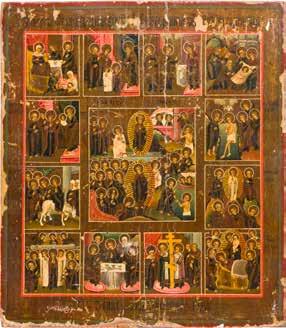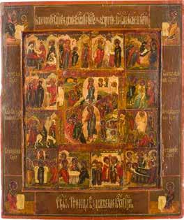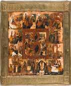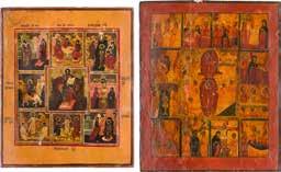A RARE ICON SHOWING THE RESURRECTION AND DESCENT INTO HELL WITHIN 14 MAIN FEASTS, THE MOTHER OF GOD ‚OF THE BURNING BUSH‘ AND THE FIVE MARTYRS OF SEBASTE