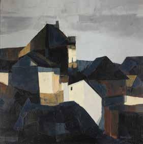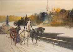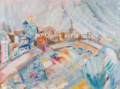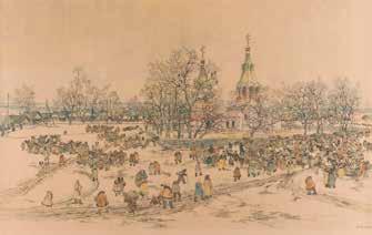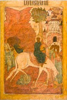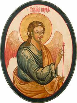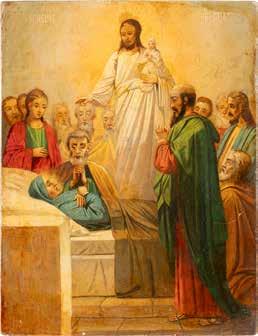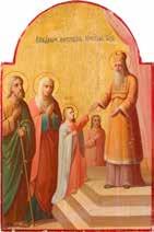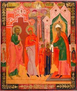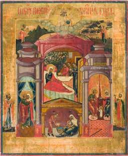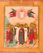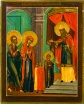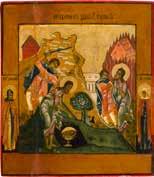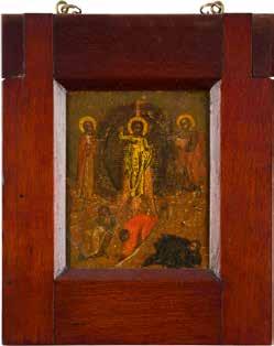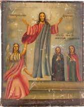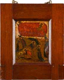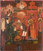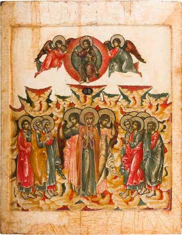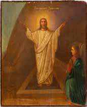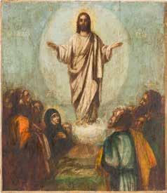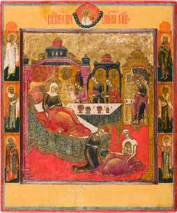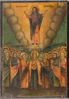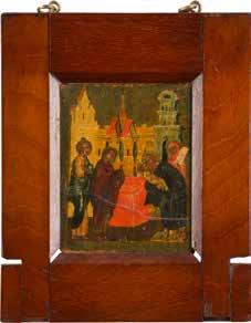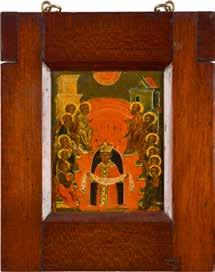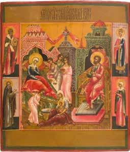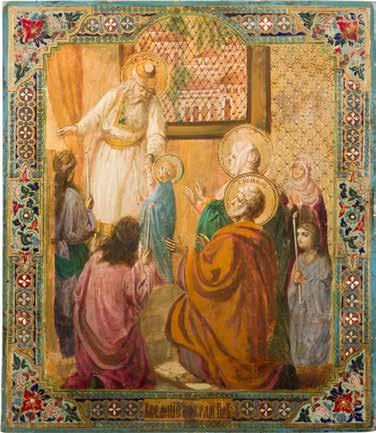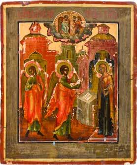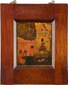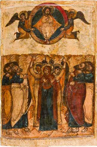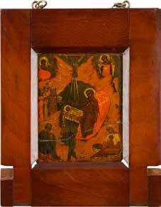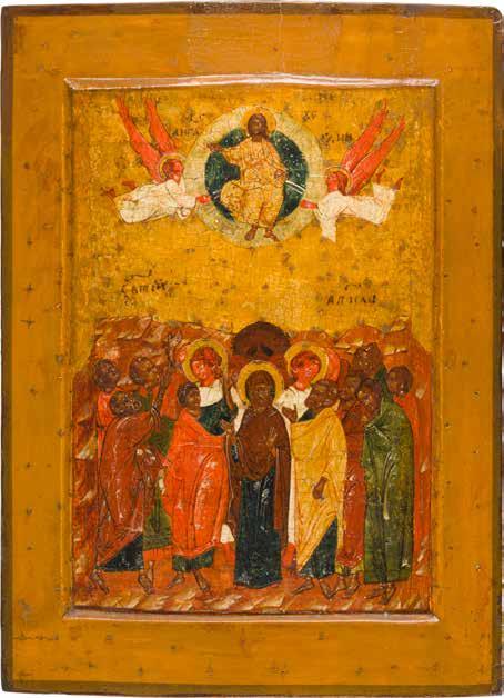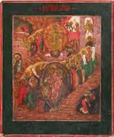 Egg tempera on wood panel with kovcheg. The Dormition depicts the death of the Mother of God. Tradition relates that when her death grew near, angels brought the apostles from different parts of the world. Christ is shown at center within a mandorla receiving His mother‘s soul, represented as an infant wrapped in swaddling clothes. Above them a red six-winged seraph. The apostles stand around her. Below a fanatical Jewish priest (sometimes named Iefoniya or Athonios) stands before the bier. Attempting to push it over, he has his hands cut off by a sword-wielding angel. In the heavenly realm the Assumption of the Mother of God, she seated on a throne with her hands extended in supplication, the Apostles on clouds, each accompanied by his guardian angel occupy the upper part of the composition. The saturated colours of the figures standing out against the pastel shades of the constructions in the background. Restored. 99 x 80 cm.