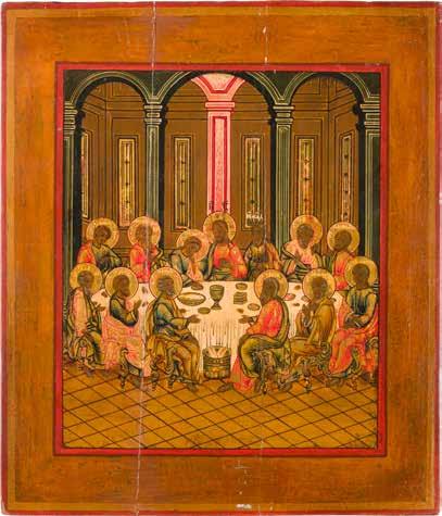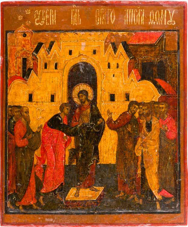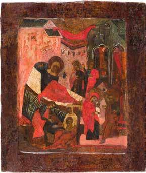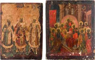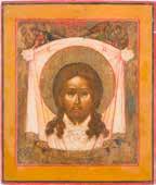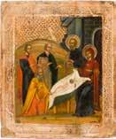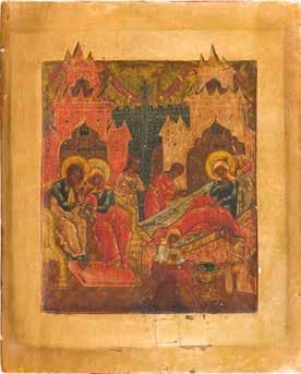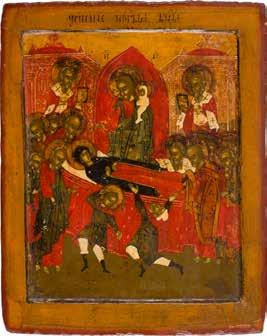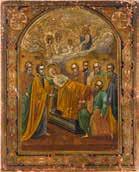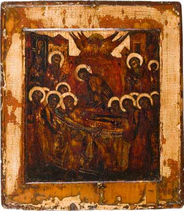 Russland, Ende 18. Jh. Aus zwei Brettern zusammengefügtes Bildfeld mit zwei Rückseiten-Sponki (verloren). Eitempera auf Kreidegrund. 110,6 x 69,5 cm. Farbe des Hintergrundes abgenommen, partiell rest. A MONUMENTAL ICON SHOWING THE DORMITION OF THE MOTHER OF GOD FROM A CHURCH ICONOSTASIS