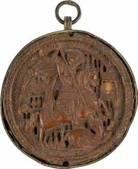 Verbund zweier Bretter mit zwei Stirnseiten-Sponki. Ölmalerei auf Kreidegrund, vergoldeter Rand ornamental graviert. 30,7 x 26 cm. Restaurierungen.