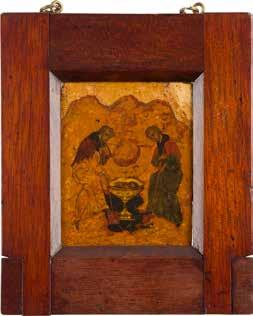 Verbund zweier Bretter mit zwei RückseitenSponki (eine verloren). Eitempera auf Kreidegrund, versilberter Hintergrund goldfarben lasiert. 43,4 x 33,8 cm. Vertikaler Riss rest.