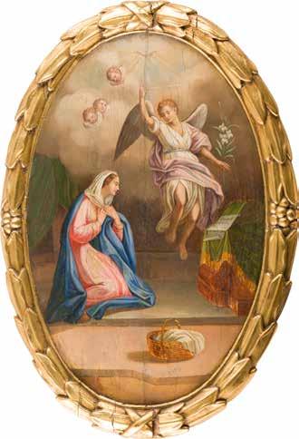 Tempera on wood panel. The haloes made of gold. Two selected saints on the borders, the Guardian Angel among them. Partially restored. 35.4 x 30.5 cm.