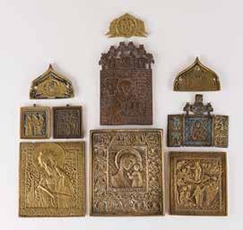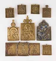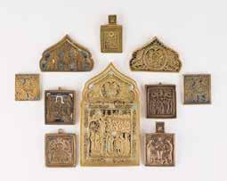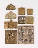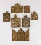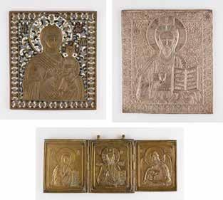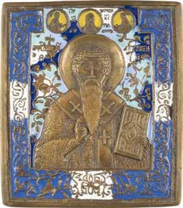 Russland, Mitte 19. Jh. Einzeltafel mit zwei Stirnseiten-Sponki. Eitempera auf Kreidegrund. Messingoklad mit getriebenem und punziertem Dekor. 35,2 x 29,3 cm. Okladrand min. besch.