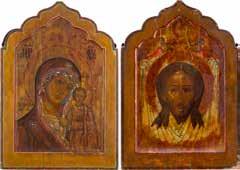 Verbund zweier Bretter mit zwei Rückseiten-Sponki. Kowtscheg, Eitempera auf Kreidegrund, Nimben vergoldet. 38,3 x 62 cm. Rest.