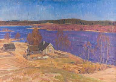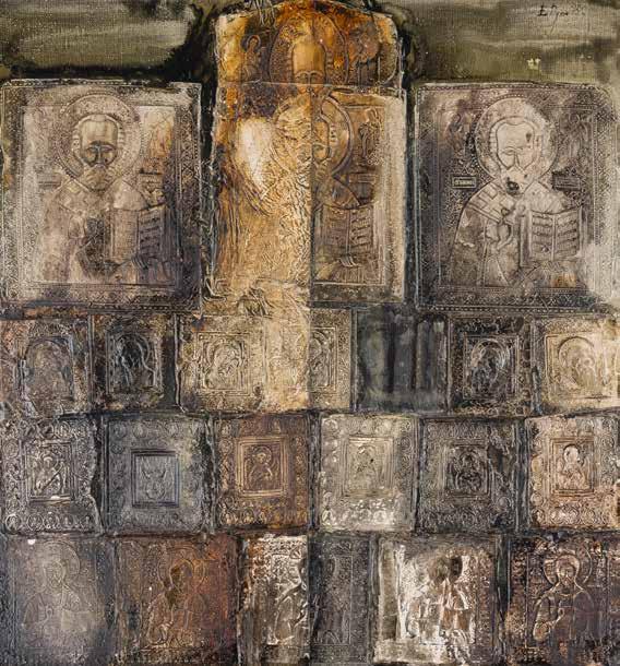 Tempera on wood panel. The background made of silver, covered by a golden lacquer. The border decorated with engraved stylized patterns emulating the metal oklads of contemporary icons. Minor losses. 44 x 37.5 cm.