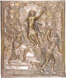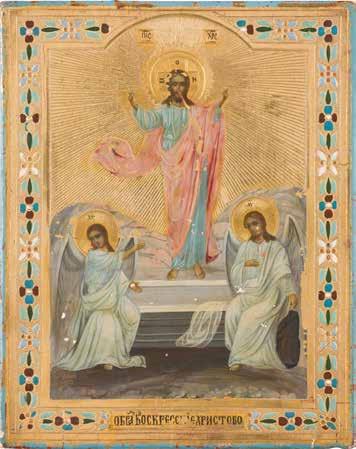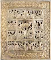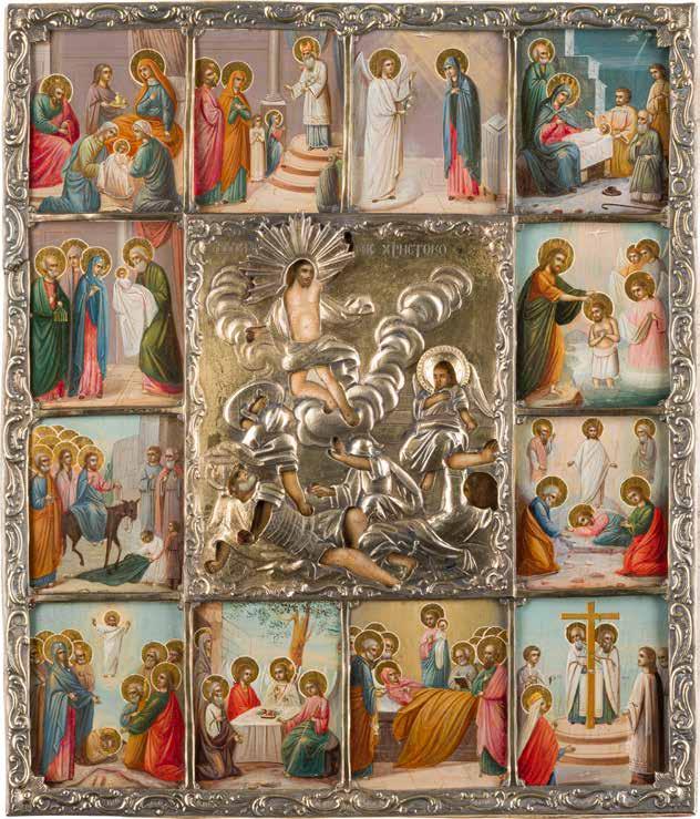 AN ICON SHOWING THE RESURRECTION AND THE DESCENT INTO HELL SURROUNDED BY TWELVE MAJOR FEASTS OF THE CHURCH WITH OKLAD