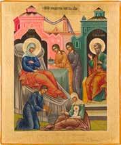 Tempera on wood panel with kovcheg. The haloes made of gold. Minor paint blistering, minimally restored. 31.6 x 27 cm.