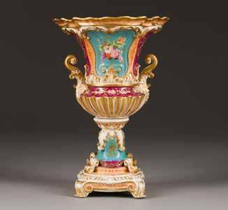 Porzellan, feine polychrome Bemalung, Vergoldung sowie goldradierter Dekor. H. 62 cm. Auf der Vorderseite unten links signiert. Feine eiformige Vase mit zwei geschwungenen Henkeln mit Widderköpfen, auf quadratischem marmoriertem Sockel mit polychromer Blumenmalerei.