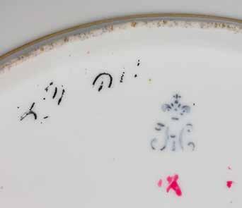 D. 23,8 cm. Aufglasurblaue Manufakturmarke ‚NI‘ unter Krone, auf der Unterseite nummeriert, datiert sowie in Kyrillisch signiert ‚E. 2. 4. 1834. N. Semenow.‘.
