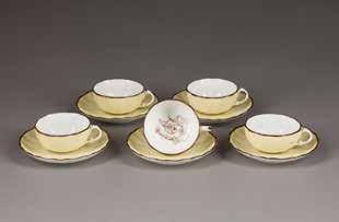 Russland, u.a. Popow Porzellanmanufaktur, Mitte 19. Jh. Porzellan, polychrome Aufglasurbemalung, Vergoldung. H. 5,6/10,5, D. 13,5 cm (Untertasse). Teils mit unterglasurblauer kyrillischen Manufakturmarke ‚AP‘ sowie Nummer ‚89.‘. Kanne part. best.
