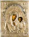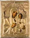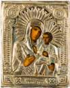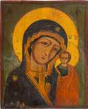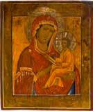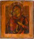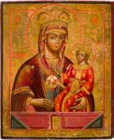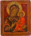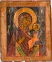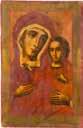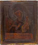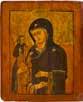 Einzeltafel. Eitempera auf Kreidegrund, Goldgrund, Nimben ornamental punziert. 53,8 x 44 cm (mit Rahmen). Bildfüllende Darstellung der halbfigurigen Muttergottes nach links. Sie trägt das traditionelle dunkelblaue Untergewand sowie das durch weiße Faltenzüge gegliederte, dunkelrote Maphorion mit goldbestickten Säumen. In ihrem rechten Arm hält sie das Christuskind, das seine Rechte im Segensgestus erhoben hat. Substanzverluste im Randbereich, partielle Retuschen.