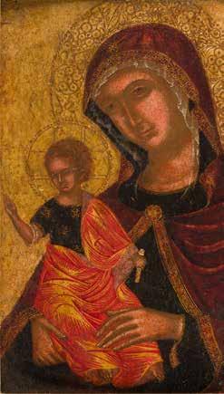 Tempera on wood panel with gold ground, haloes gilded, the border carved with floral motifs. Some rubbing, losses, partly restored. 42 x 29.3 cm.