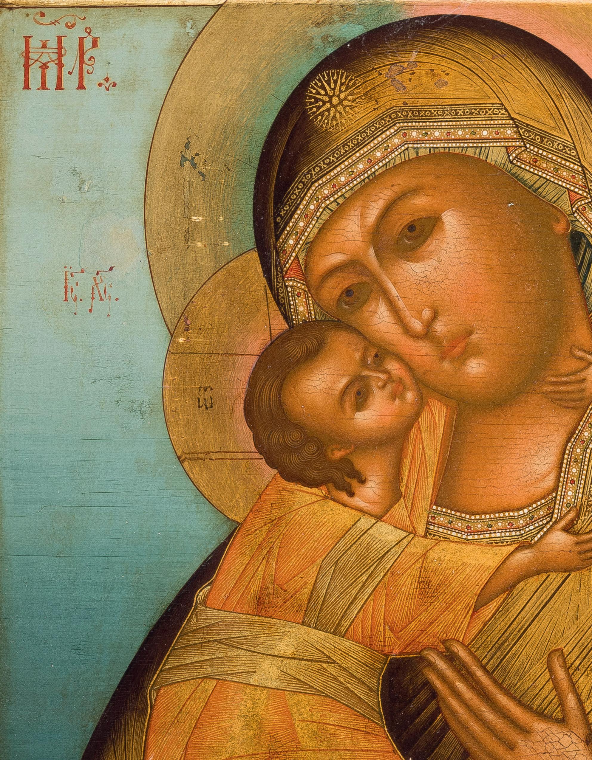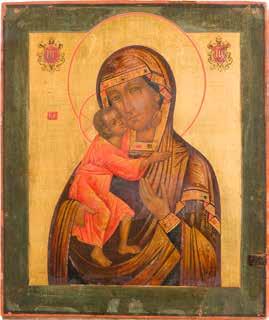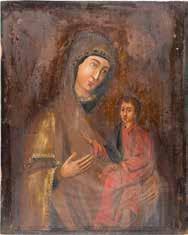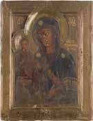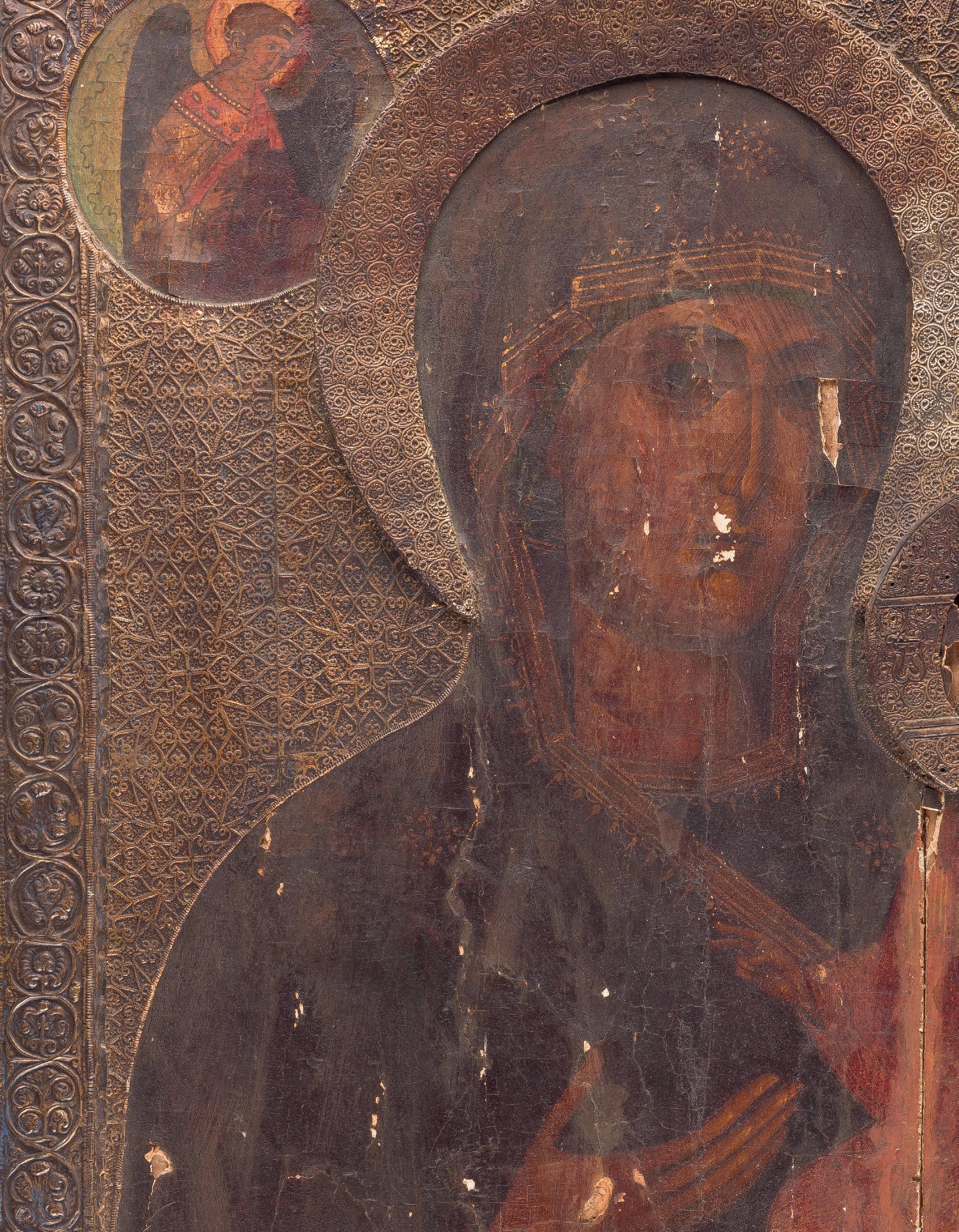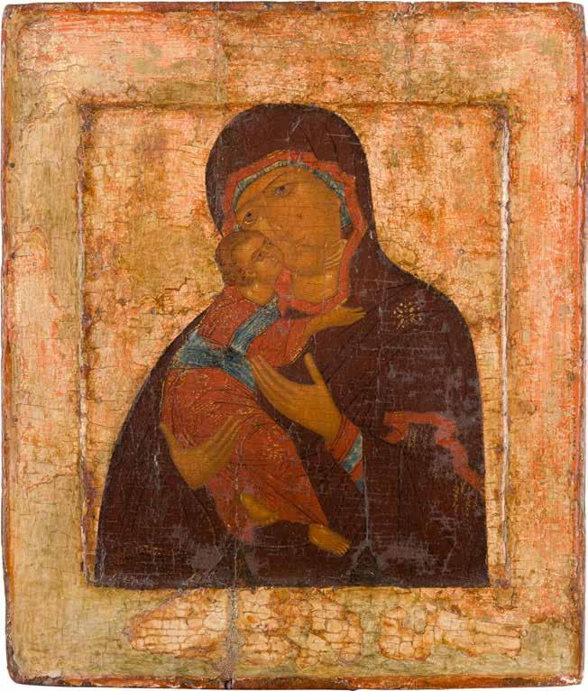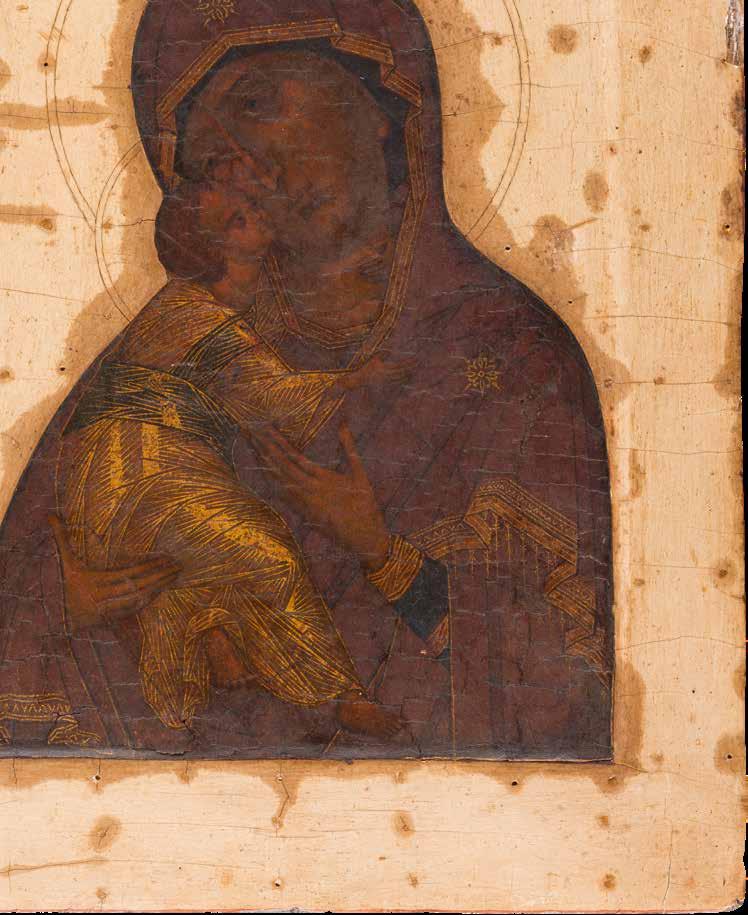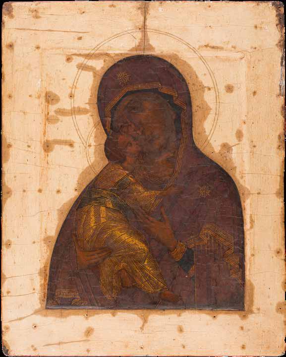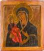 Tempera on a wood panel. Executed on a gold ground. The Mother of God depicted half-length wearing a blue tunic and a purple maphorion fastened at the chest with a transparent white veil draped over her hair. The orange mantle of Christ decorated with fine gold lines and the hems of the mantle of the Mother of God decorated with refined pseudo-Kufic motifs. Minor losses to the edges, areas of retouching. 53.8 x 44 cm (with frame).