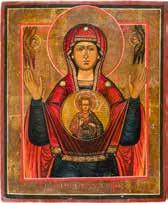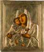 Tempera on wood panel with kovcheg. Finely painted in great detail against a golden background. The enthroned Mother of God, seated on an elaborate throne and flanked by angels. The border rendered with scrolling foliage. The edges minimally chipped. 29.8 x 23 cm.