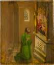 Tempera on wood panel. The haloes made of gold. Painted naturalistically mostly with browns, maroons and complimentary greens. Minor areas of retouching to the edges. 43.7 x 36.2 cm.