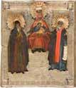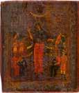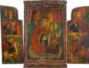 840 | ZWEIFELDER-IKONE MIT DER GOTTESMUTTER UND DEN HEILIGEN NIKOLAUS VON MYRA UND JOHANNES CHRYSOSTOMUS