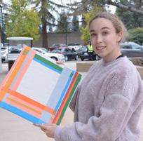 READY TO VOTE Arushi Sharma (11) and Joelle Weng (11) pre-register to vote, handing completed forms to a representa tive from the League of Women Voters.