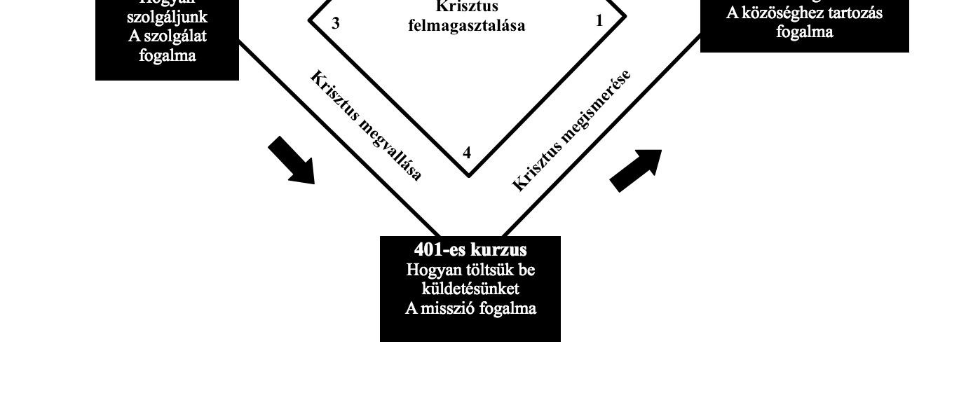 A folyamat lezajlása érdekében a mozgalom négy meghatározó fontosságú képzést kínál a gyülekezeti tagok számára a következő témakörökben: 1. a 101-es tanfolyam a gyülekezeti tagságra készít fel; 2. a 201-es a lelki érettségről szól (tanítvánnyá válás); 3. a 301-es a szolgálat végzésére képez ki; 4. a 401-es pedig a küldetés végzésére (bel- és külmissziói utak, evangelizáció a környezetünkben). Az alábbi ábra ezt szemlélteti.