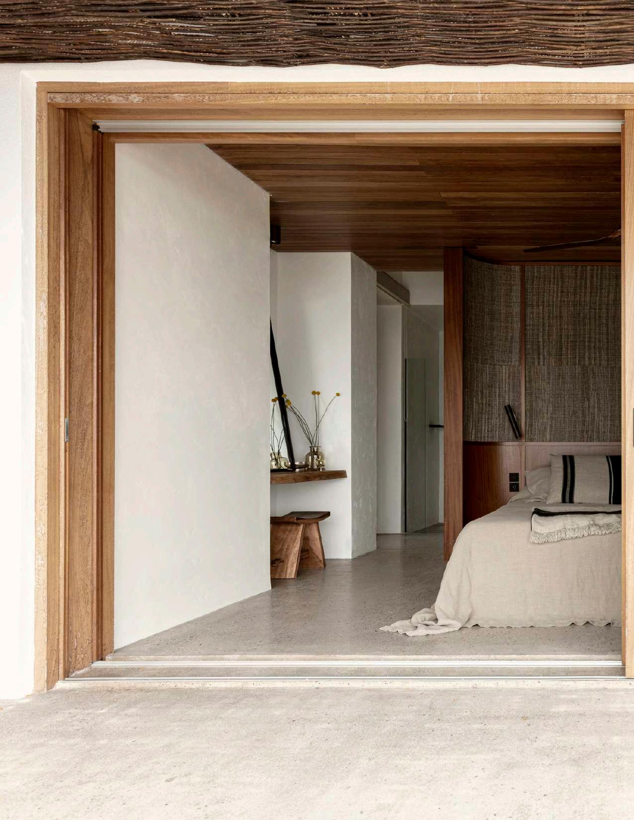 The living room has a smooth composition of materials: stone floor and walls, concrete ceiling and wooden panels. This clearer and more welcoming composition of natural materials contrasts with the composition of furniture textures, such as leather and linen. Light invades the interior through the rope brises, which bring beauty and dynamism to the facade, helping to provide sun protection and also privacy, when necessary.