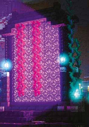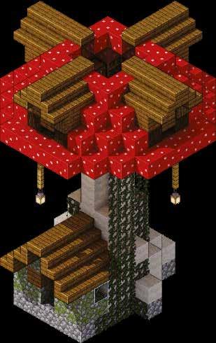 Start de hoed van de paddenstoel met een 5x5 laag van een paddenstoelenstam, sparrenhouten planken en rode paddenstoelen-blokken, zoals afgebeeld. Hang lantaarns op met sparrenhouten hekken en bekleed de stam met lianen.