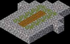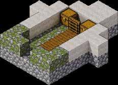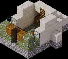 Start de muren vanaf de rand van de fundering met mossige keisteen en paddenstoelenstammen. Plaats een valluik, open het en hurk je om er een ladder tegenaan te zetten. Zet twee kisten neer.