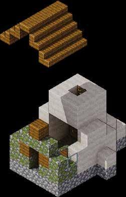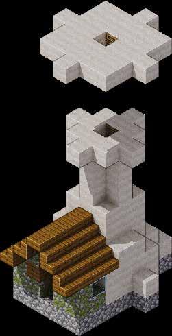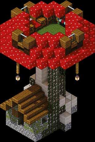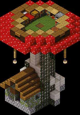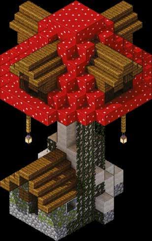 Plaats drie blokken van mossige keisteen en een sparrenhouten plank boven de deuropening en maak een dak van eiken trappen en platen, zoals afgebeeld. Ga dan verder met de stam van twee 3x3 ringen van paddenstoelenstammen en verleng de ladder in de stam.