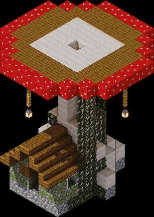 Voeg een ring van rode paddenstoelenblokken, sparrenstammen en sparrenhouten platen toe. Verleng de ladder tot aan de bovenste verdieping en leg er een sparrenhouten valluik op.