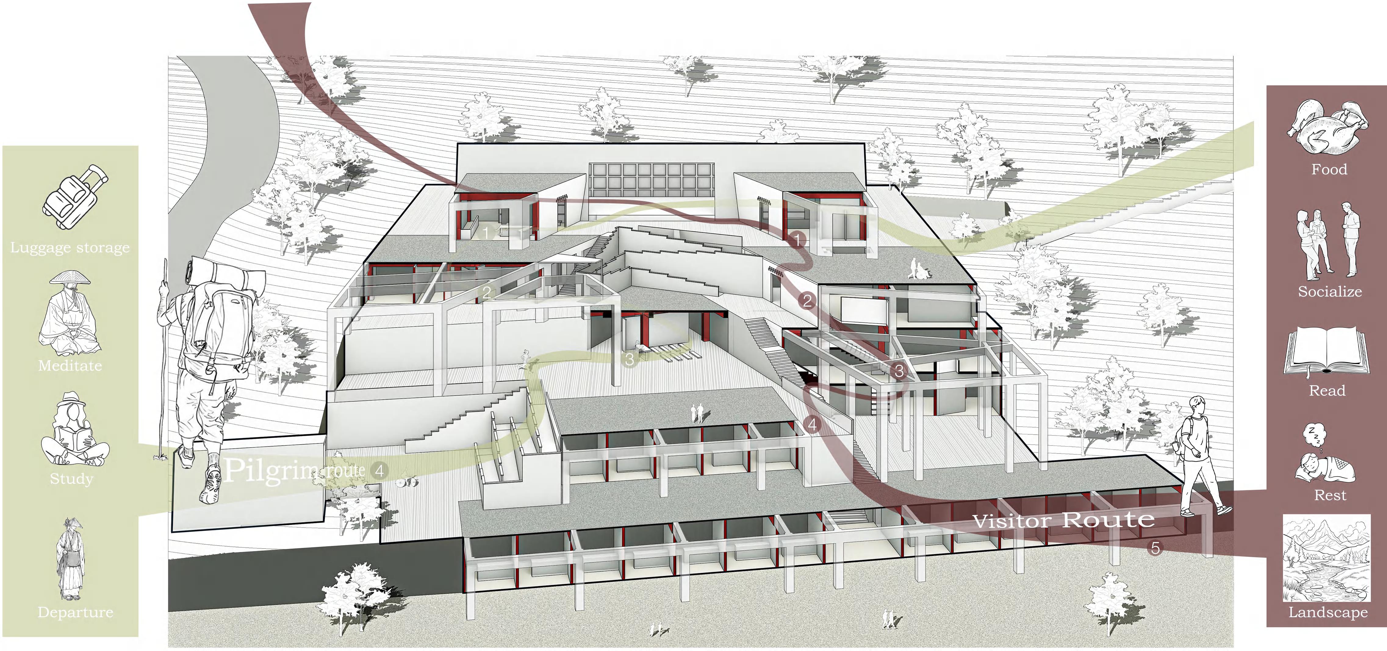 This is the back of the building, providing a buffer area for tourists coming from the back to rest and have fun, reducing the sense of oppression caused by the close proximity of the rear buildings. At the same time, the larger buffer area provides an area with a wide field of vision, allowing people in the back to directly see the facade. So that they can "read the content of the storyboard"