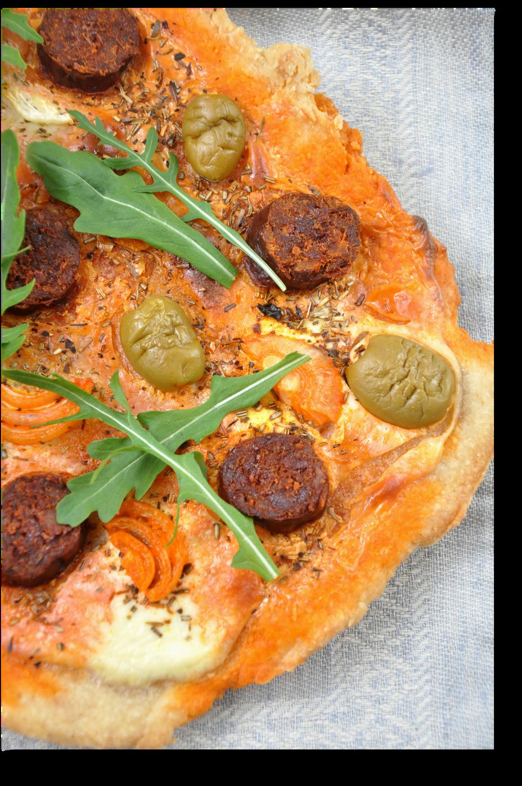 Romesco Sauce + Spanish Chorizo + Mozzarella + Queen Olives + Roasted Red Peppers