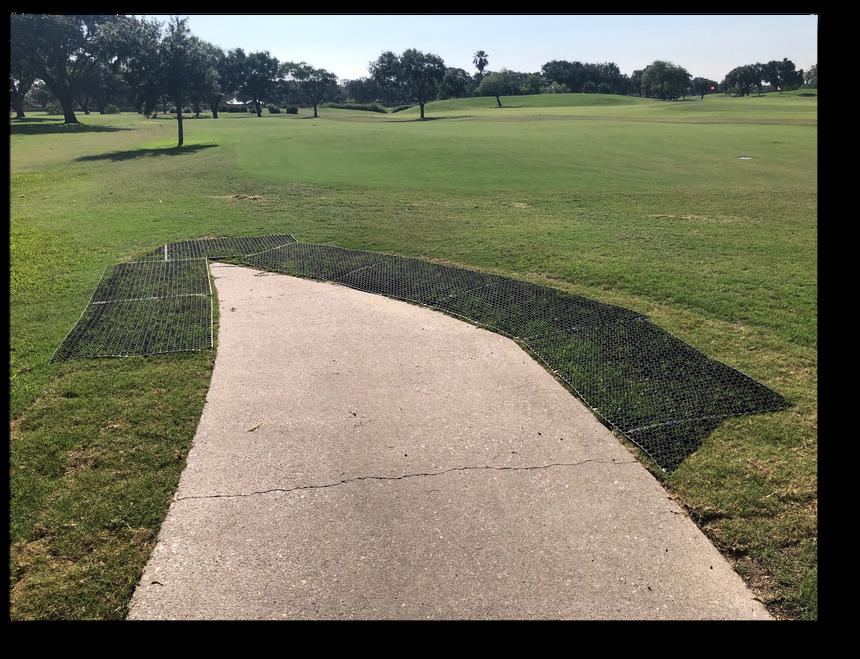 A test area of Traqmatz was installed at the end of the cart path near #1 tee box last week. The product is intended to absorb compaction from concentrated cart traffic while allowing the grass to grow through the open holes. New sod alone would eventually thin and become bare, so the goal of this product is to prevent wear and compaction and allow the grass to thrive. It will remain roped off for a few weeks to allow establishment, and then carts will be allowed to drive over the area.