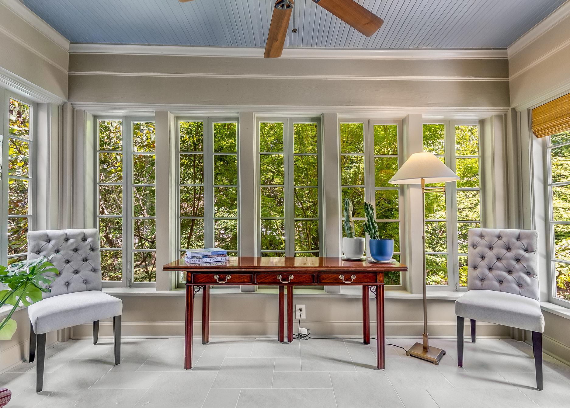 The bright dining room includes elegant trey ceilings, while the sunroom, offering treetop views, is ideal for an office or a quiet place to relax.