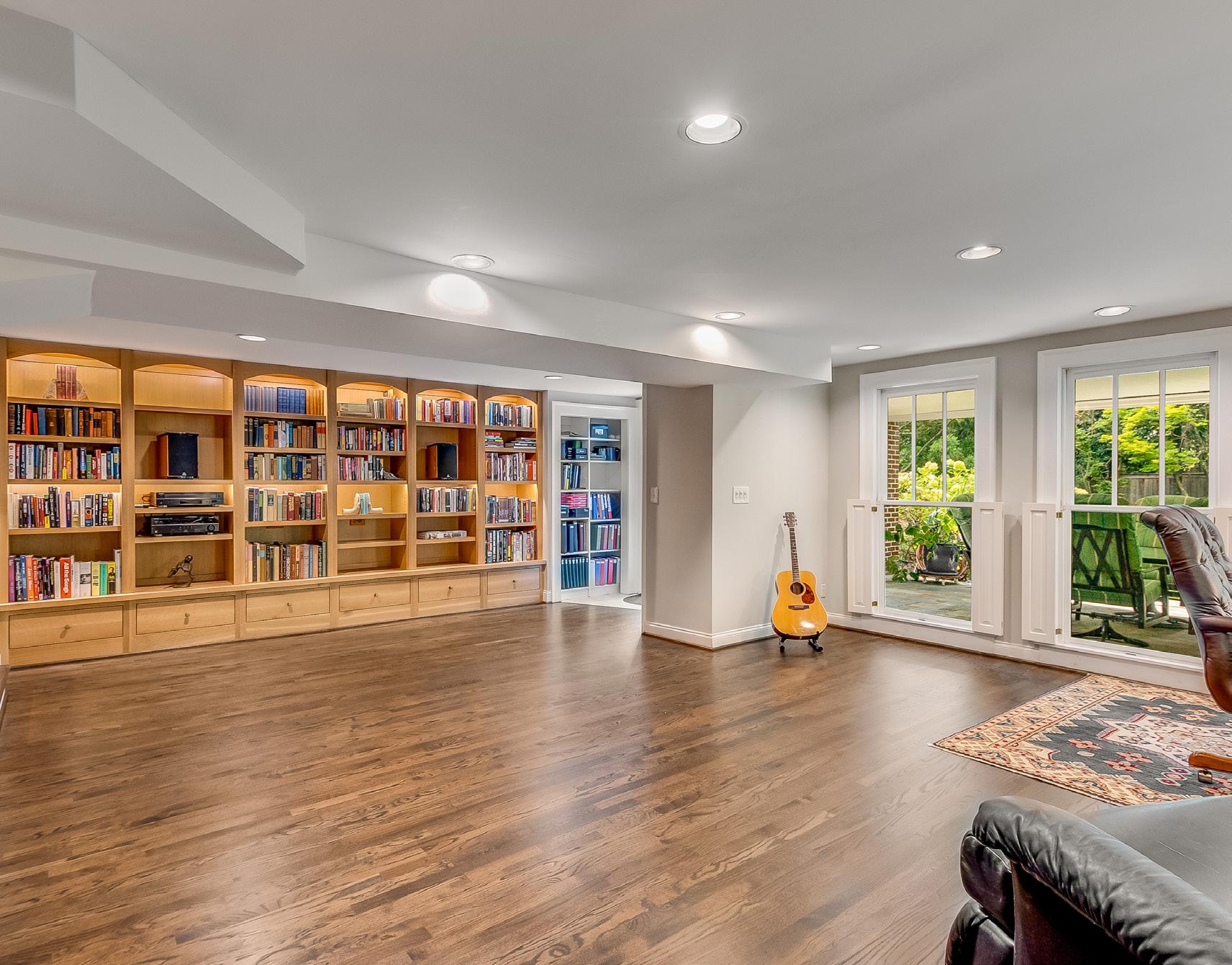 The finished terrace level includes a guest bedroom, full bathroom with shower, home office, secondary laundry and a versatile bonus room with custom bookcases, perfect for play, family gatherings, or hobbies.
