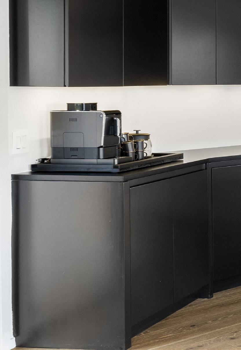 Custom fluted wood features with hidden doors add a touch of intrigue and functionality, while the ambient lighting design creates the perfect mood for any occasion. Wide plank white oak hardwood floors flow seamlessly throughout the home, adding warmth and organic texture to the modern elegance.