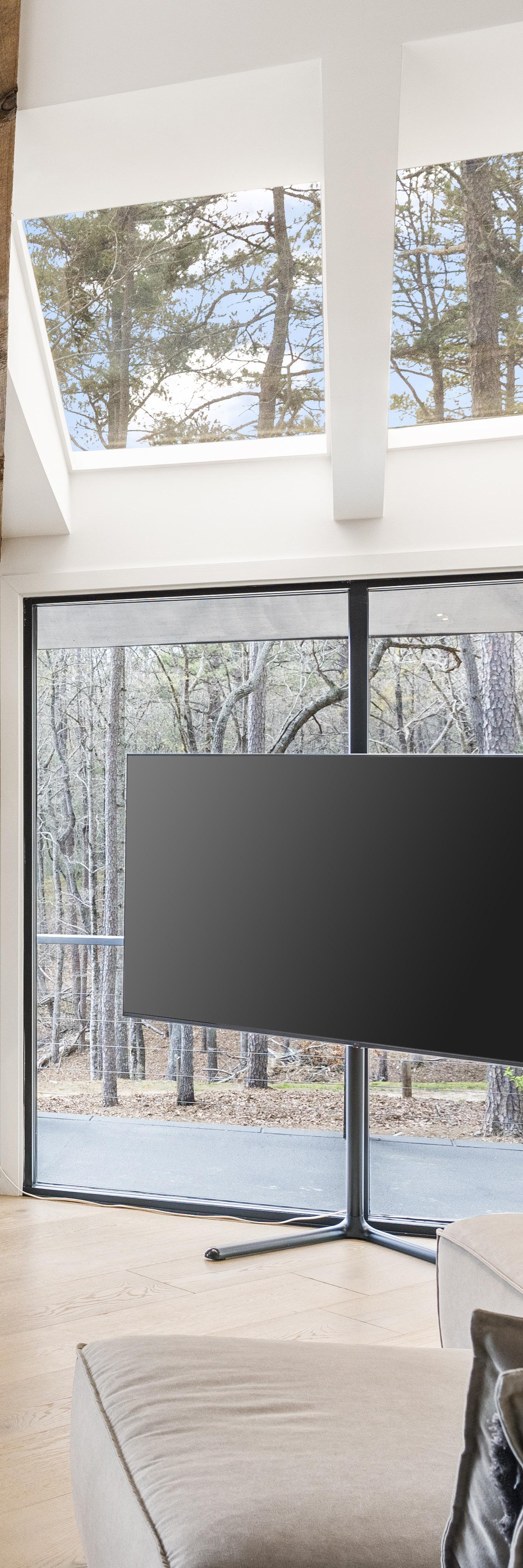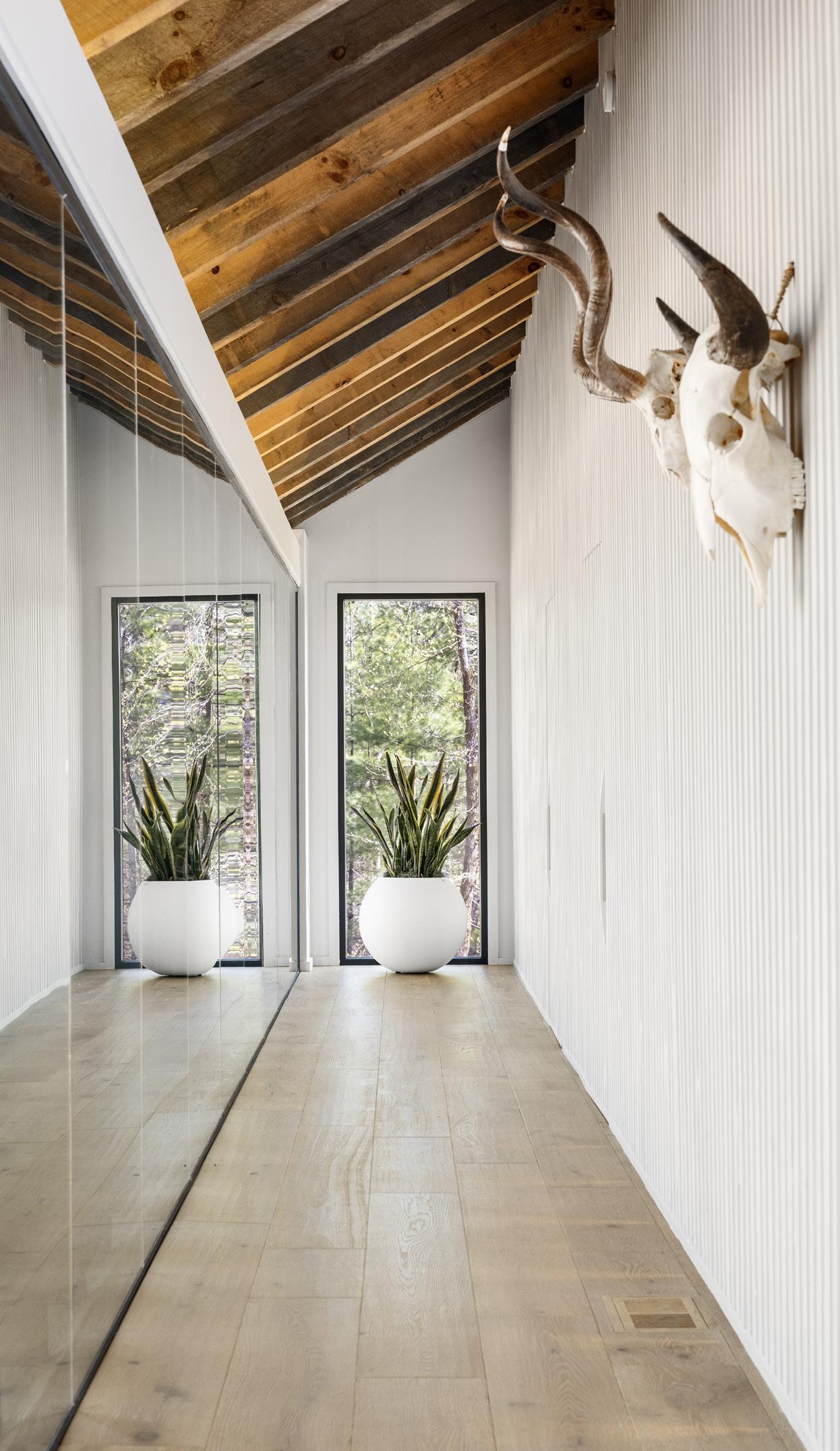 Experience the grandeur of single-level living. Soaring vaulted beam ceilings and a dramatic floor-to-ceiling glass hallway leading to the bedrooms create an awe-inspiring sense of openness.