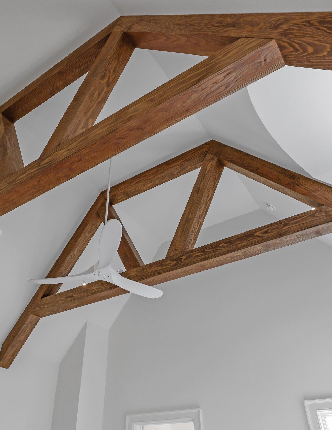 is showcased with 7-inch white oak flooring, wooden beams, a limestone fireplace, and a 4-panel sliding door connecting indoor and outdoor living.