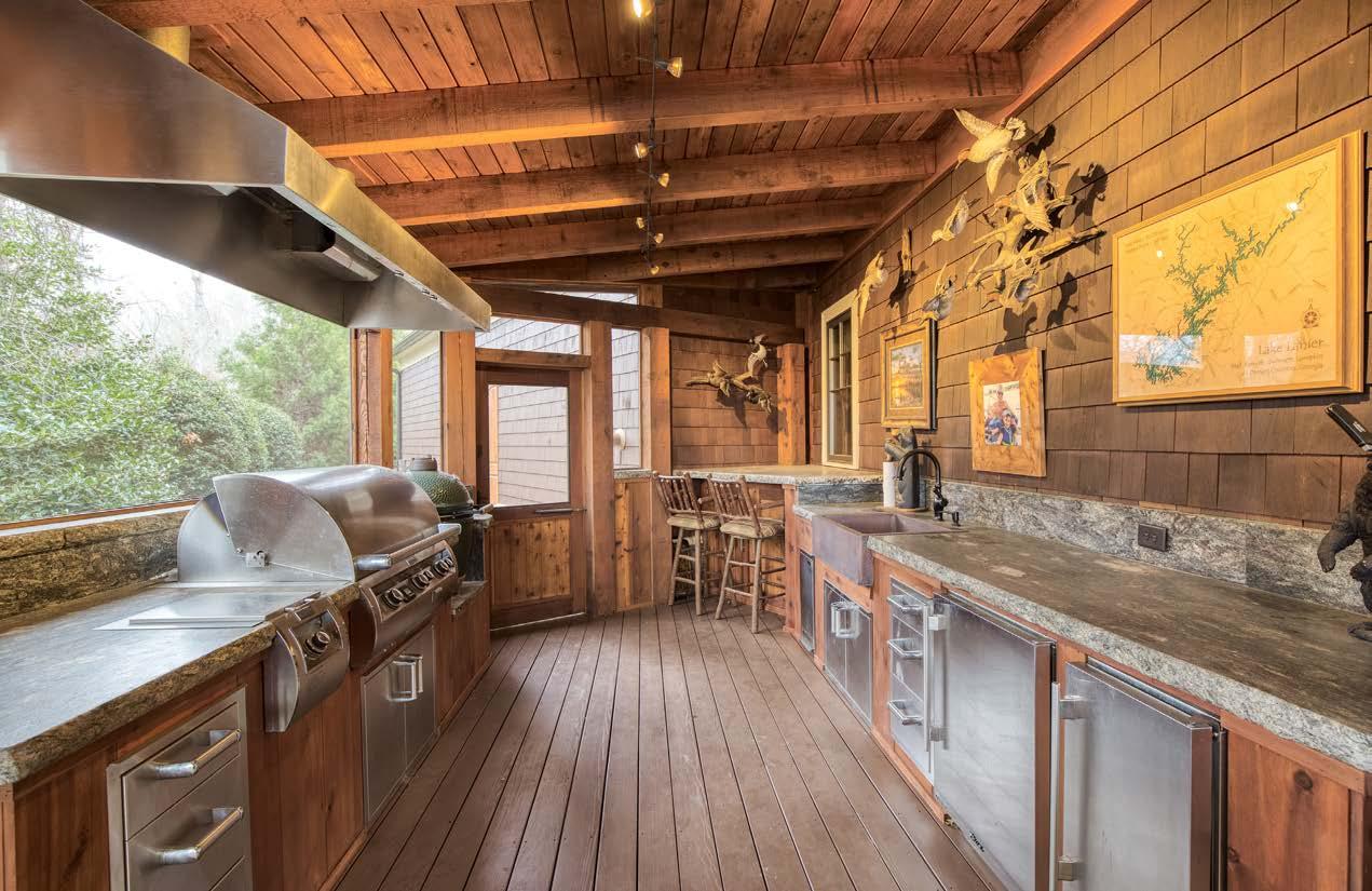 Designed for year-round enjoyment, a screened-in porch presents a wood-burning stone fireplace and built-in outdoor kitchen—equipped with a Fire Magic grill, Green Egg, undercounter refrigerator, ice maker, copper sink, and granite countertops.