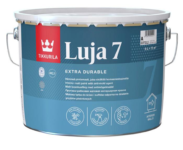 Luja pintamaali on paras valinta tilaan, joka on alttii na lialle ja kovalle rasitukselle. Kestää pesua voimak kailla pesuaineilla./ Luja 7 matt täckfärg är det bästa valet för utrymmen som utsätts för smuts och starka påfrestningar. Tål rengöring med kraftfulla rengörings medel. PMA 2,7 l (EH28), PMA 9 l (EH30)