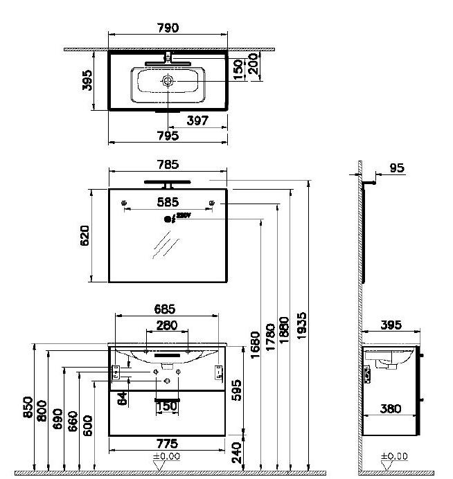 Kosteudenkestävä melamiinipinnoitettu kalustelevy, runko ja ovet kiiltävä valkoinen, 2kpl softclose-laatikot, kromatut vetimet. Valkoinen ylivuotosuojalla varustettu Vitra -posliiniallas (790x390mm) ilman pohjaventtiilia ja vesilukkoa.