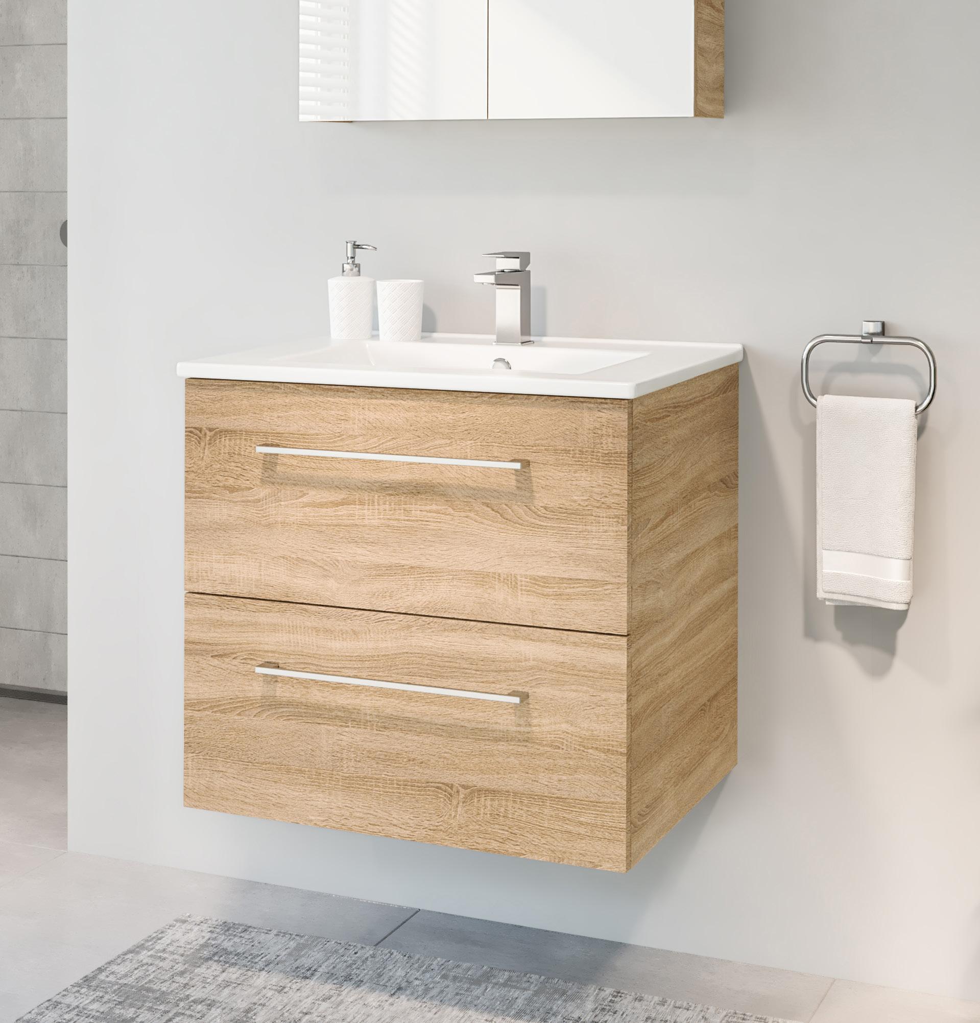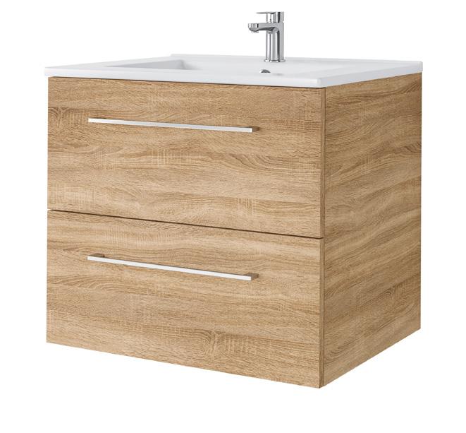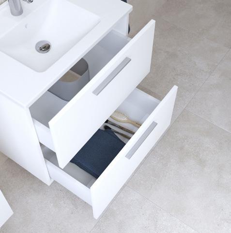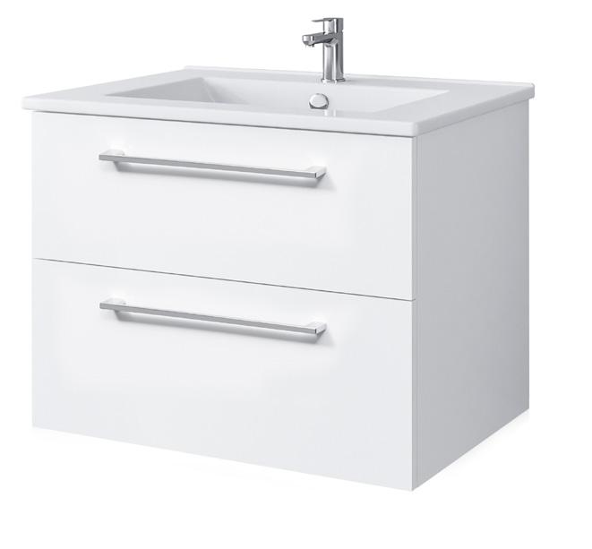 Kosteudenkestävä melamiinipinnoitettu kalustelevy, runko ja laatikot korkeakiilto valkoinen, 2 kpl softclose-laatikot, kromatut vetimet. Valkoinen ylivuotosuojalla varustettu posliiniallas ilman pohjaventtiliä ja vesilukkoa.